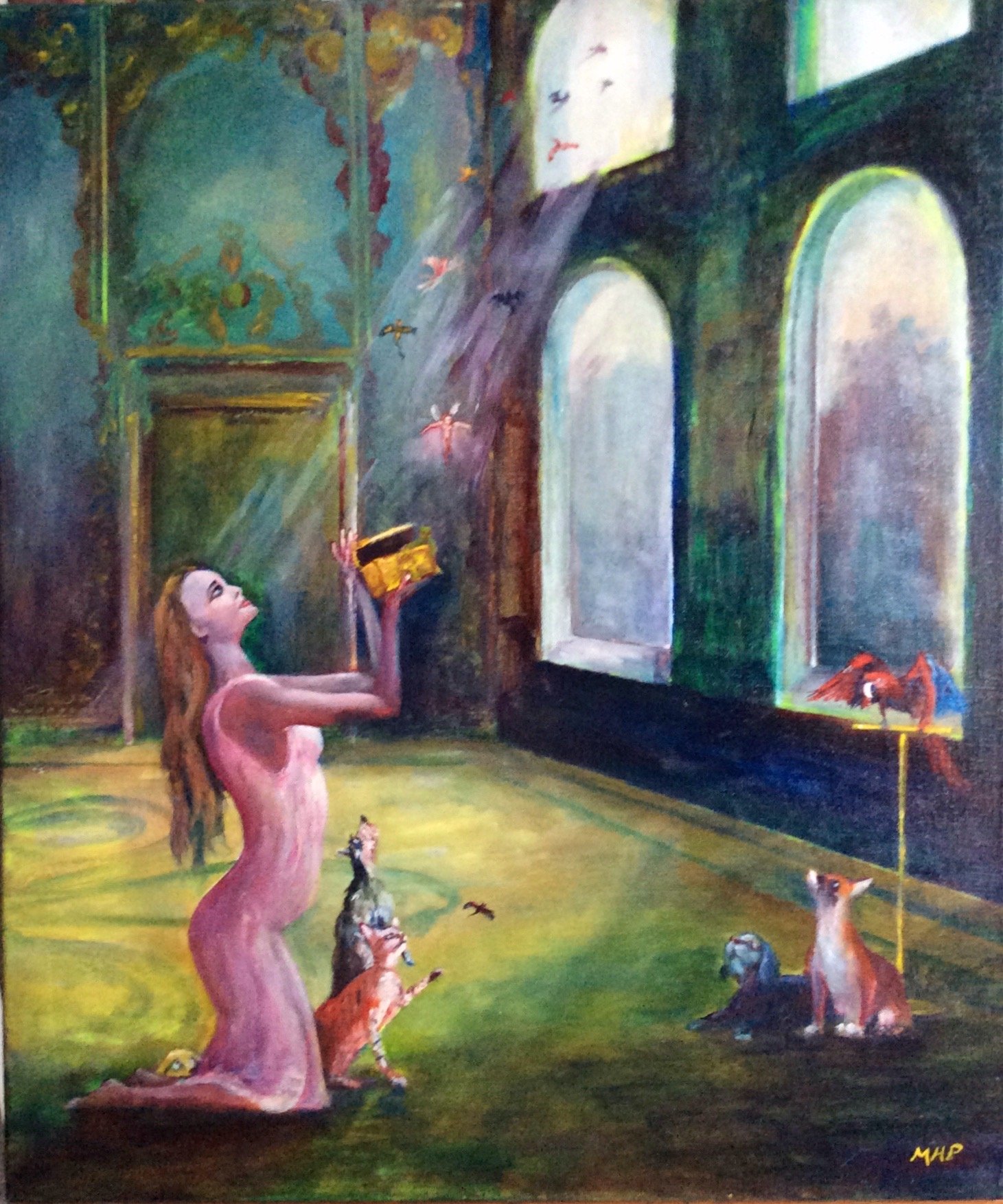 The picture shows Pandora at home with her pets as Hope flies from the casket. Oil on acrylic ground. 49cm x 59cm inc frame and ready to hang.