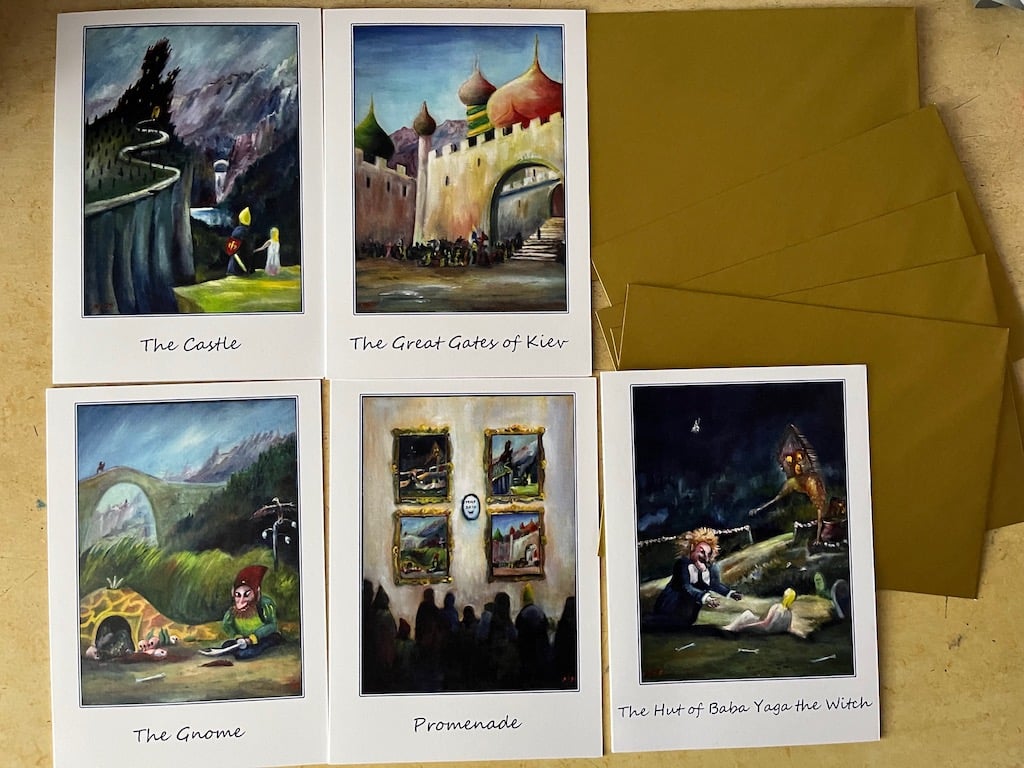 A pack of 5 different greetings cards with envelopes, depicting various movements from Mussorgky's musical epic "Pictures at an Exhibition": The Castle, The Gnome, The Great Gates of Kiev (not Kyiv in this instance), The Hut of Baba Yaga the Witch and Promenade, in which the other 4 pictures appear with characters rom them viewing.