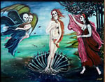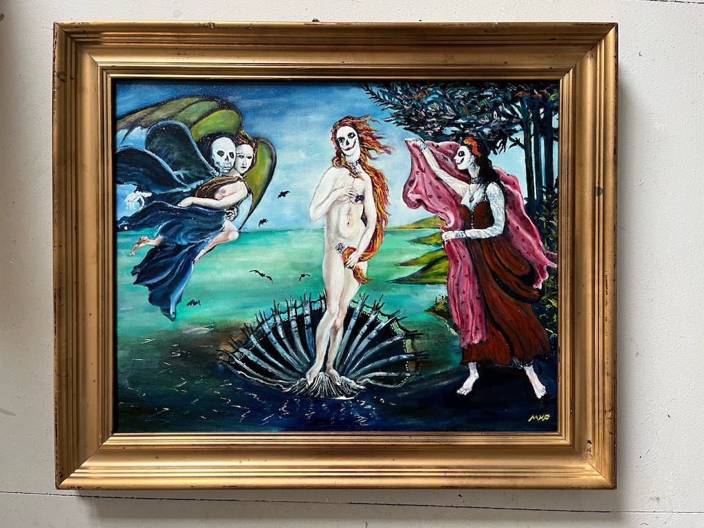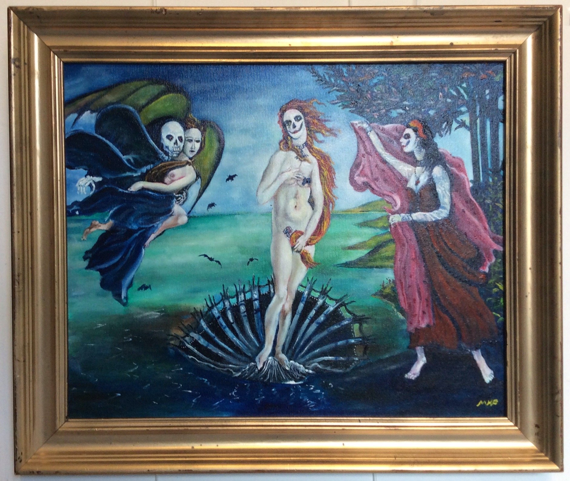 A bit of fun with Botticelli's Birth of Venus. Wouldn't this look classy in a bedroom or boudoir? This oil painting is presented in a distressed gold leaf frame which gives the impression of age and finely suits the work itself. Size, including frame, is 60cm x 50cm. Ready to hang.