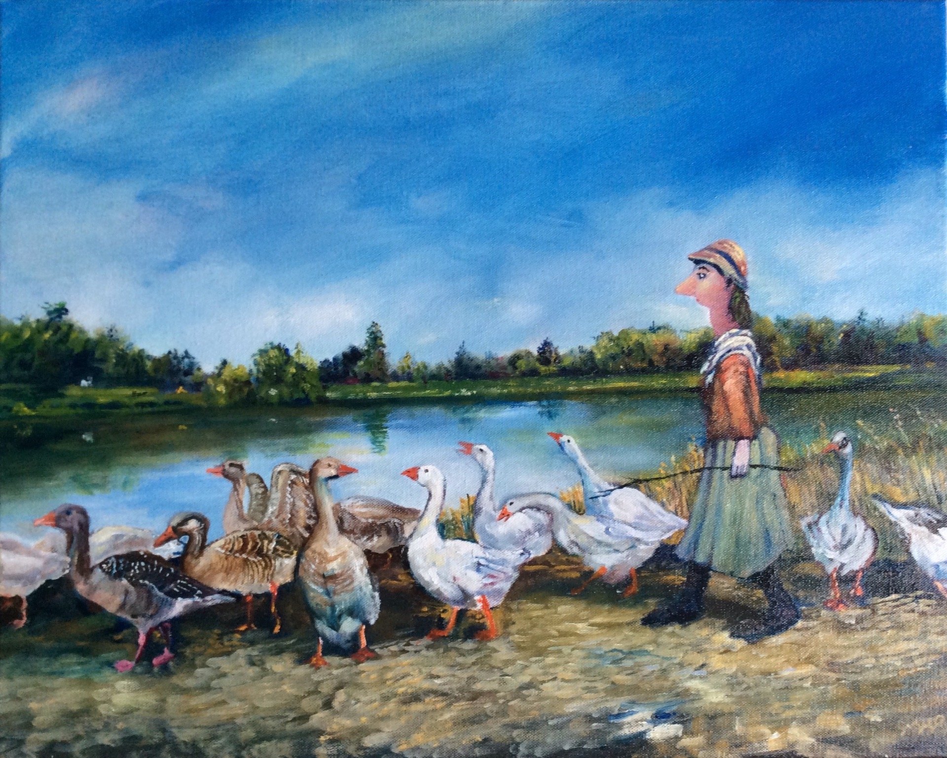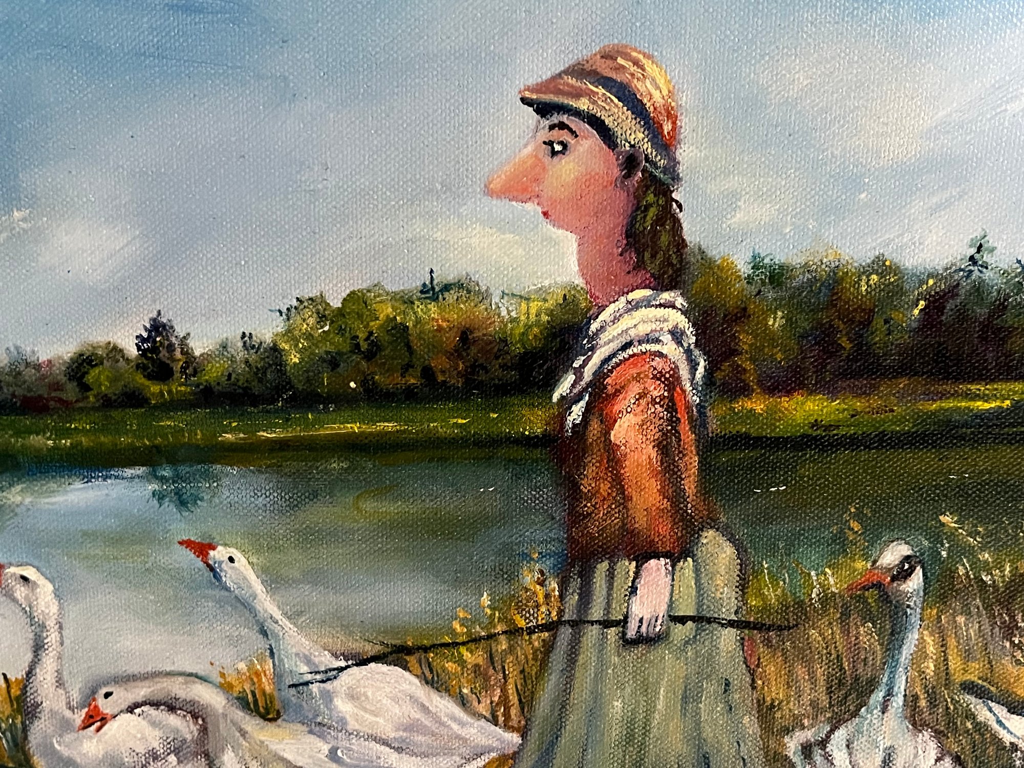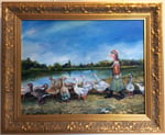 Many artists have painted The Goose Girl, a Brothers Grimm fairy tale, but few have painted her to look like a goose. This charming and sympathetic oil painting with both beautifully depicted geese and girl will grace any wall.