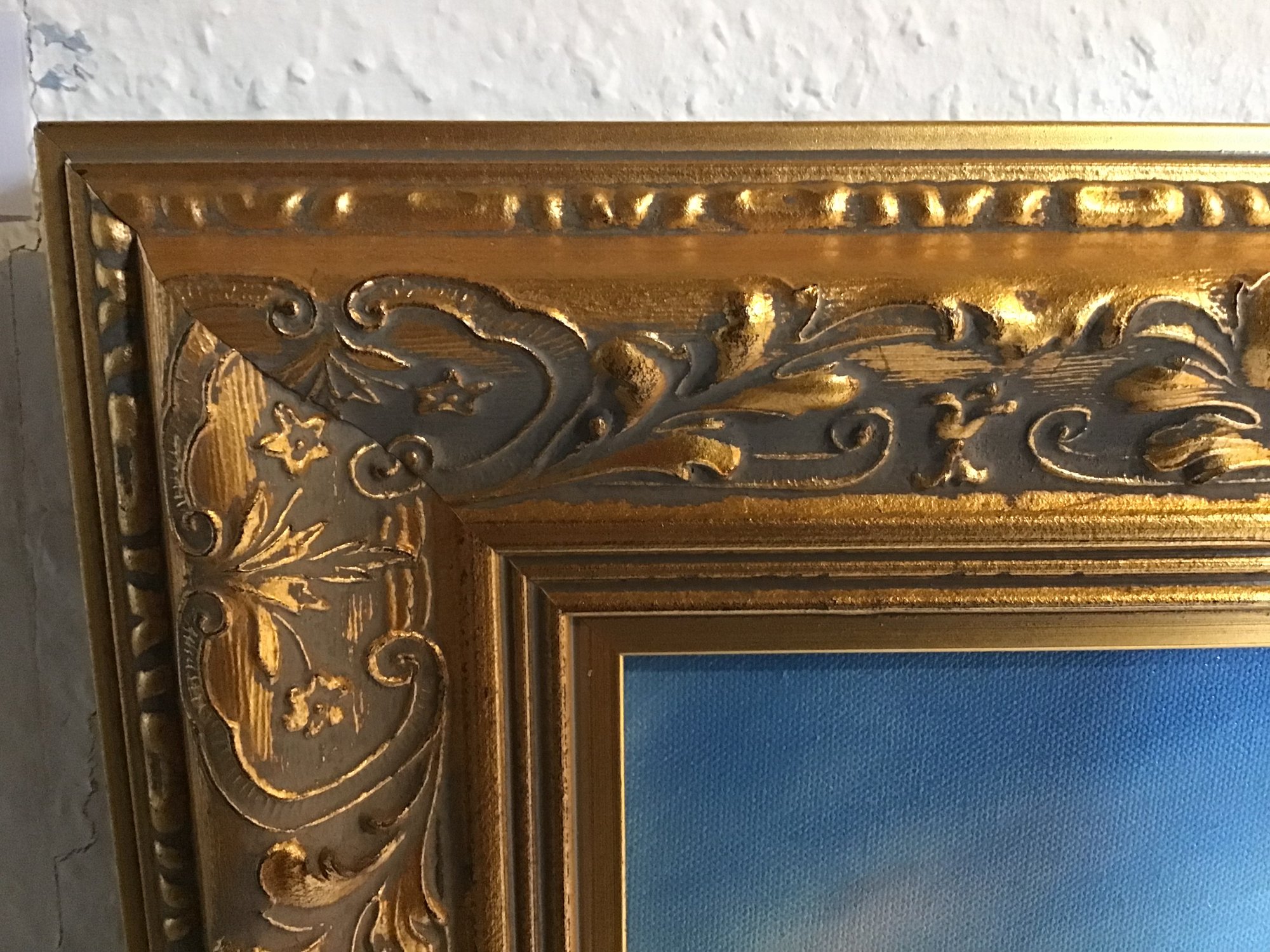 65cmx55cm (inc frame size) in a beautiful, ornate golden frame. D-rings and cord affixed.